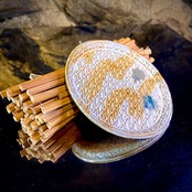 大麻の蚊帳生地で包んでから大麻縄文絡条体(棒に麻紐を巻きつけた道具)を転がして仕上げています。この手順により歪みなく平らに仕上がるという伝統技術です。
